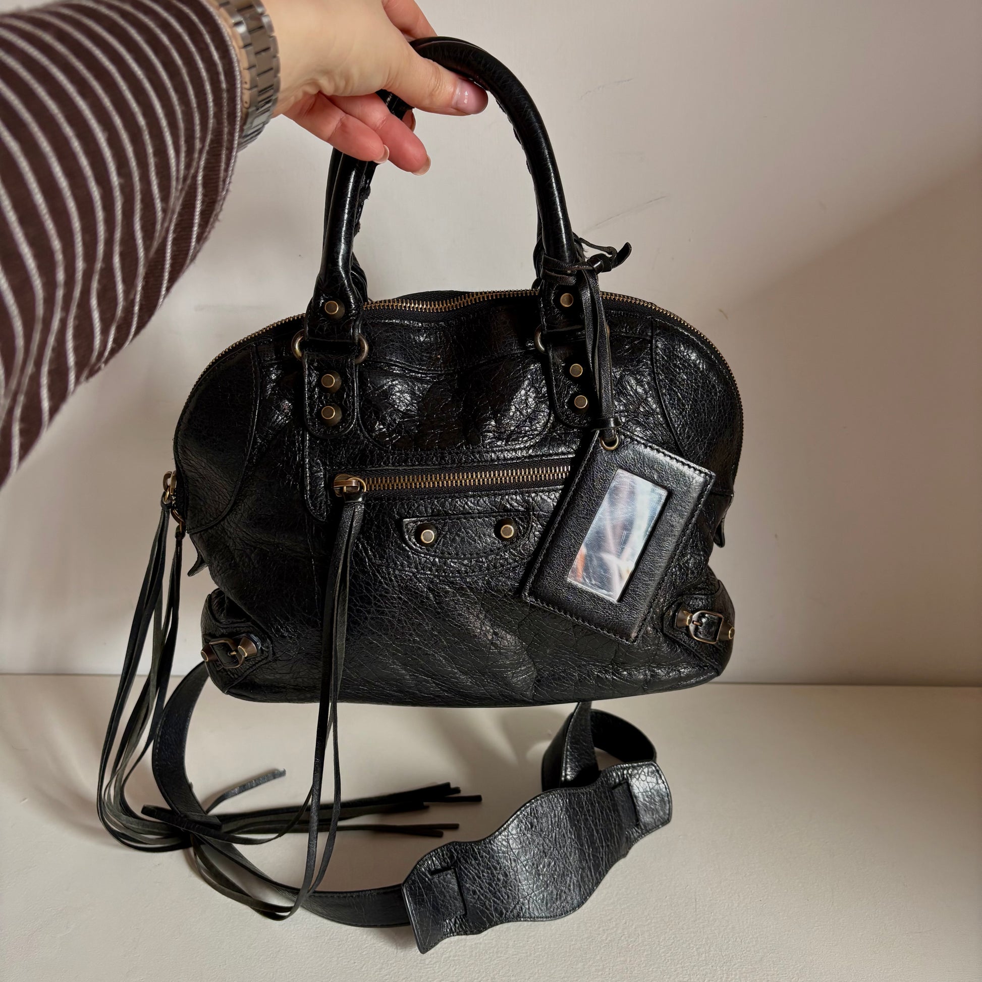 Tasca frontale con zip, borchie iconiche e specchietto originale removibile.