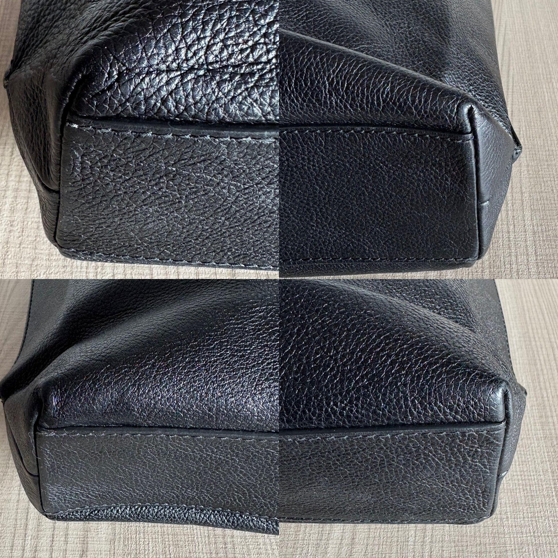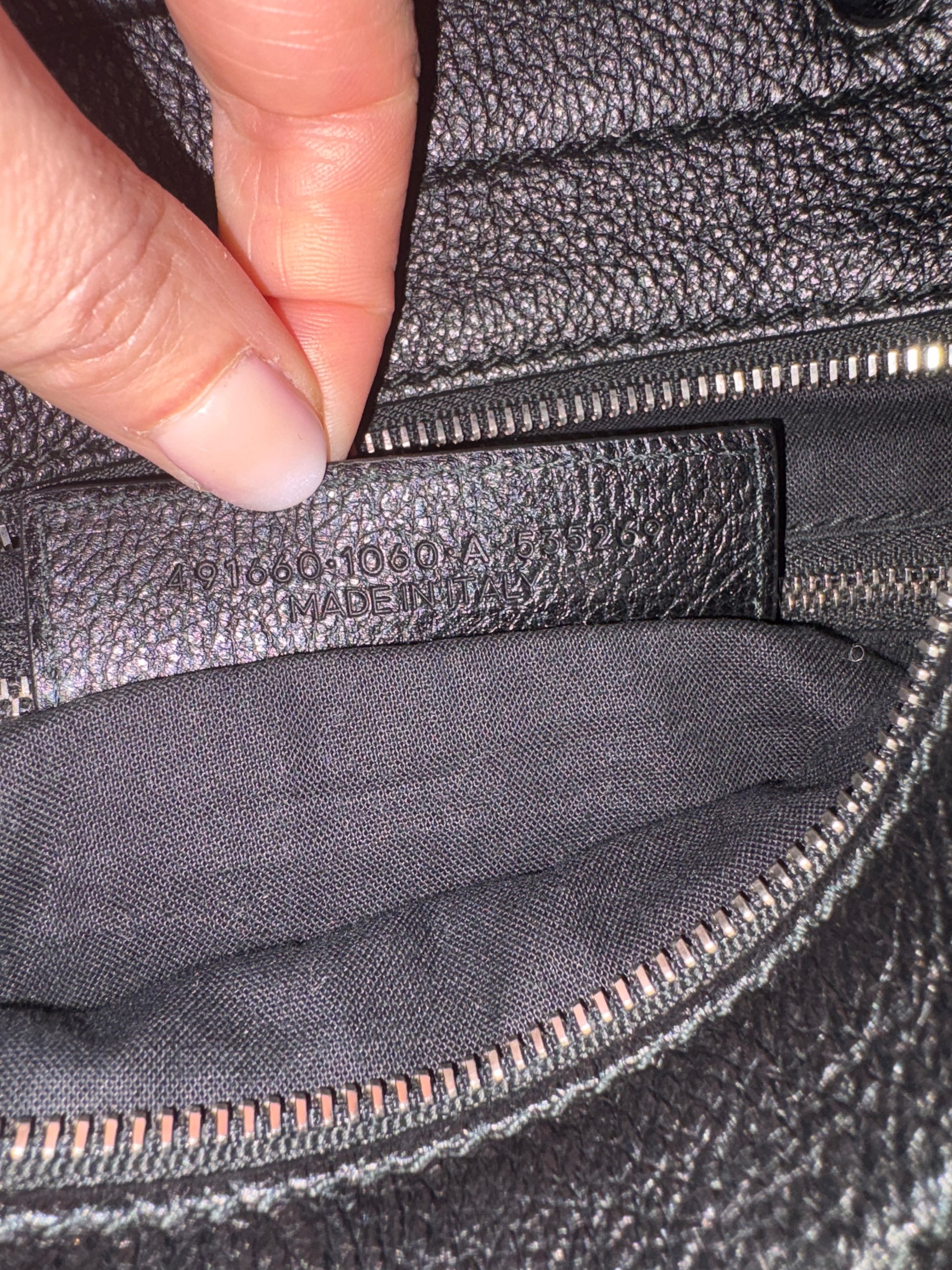 iconica shopping bag Balenciaga in pelle martellata nera con logo frontale bianco.