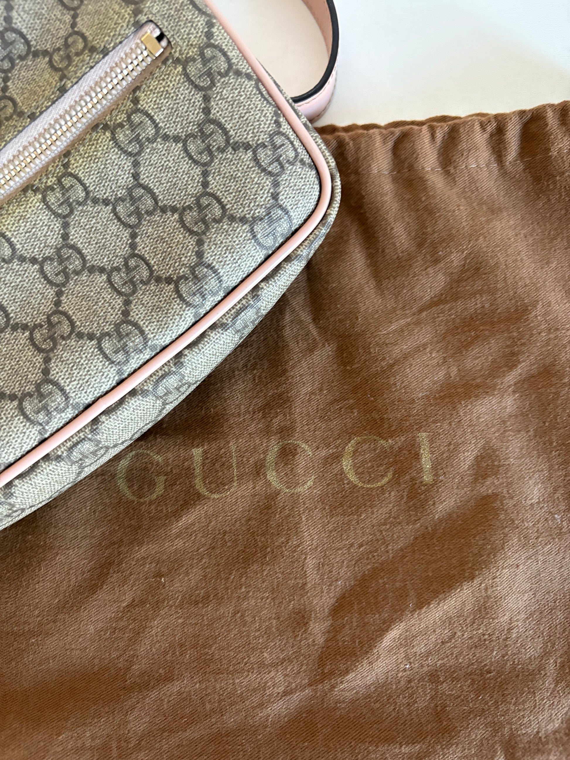 Borsa a tracolla in tela GG Supreme con profili in pelle rosa cipria, tasca frontale con zip e chiusura superiore con zip.