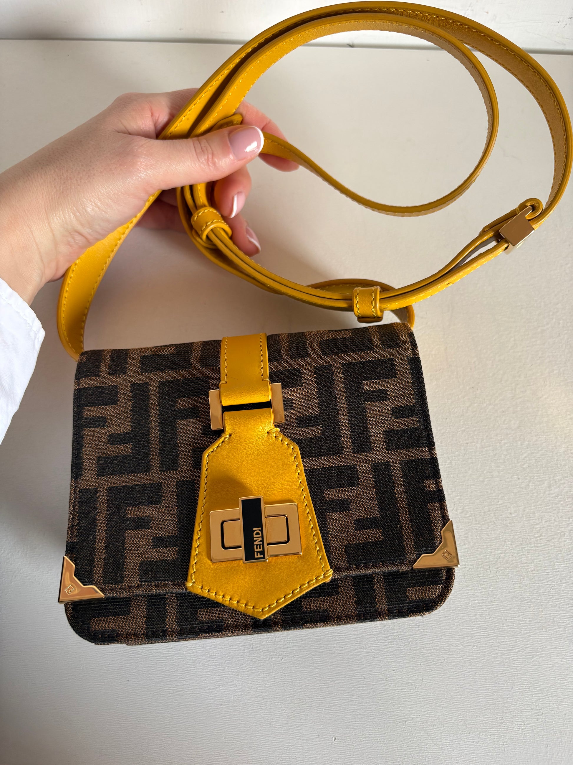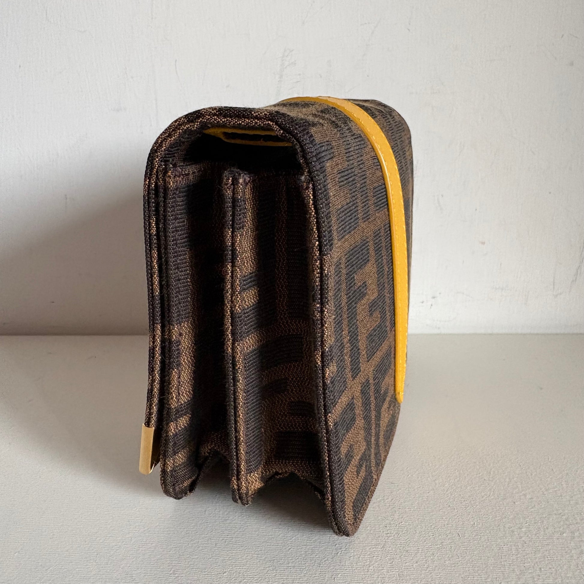 Borsa compatta dal design iconico con monogram FF zucca marrone e dettagli in pelle gialla, perfetta come complemento elegante per outfit quotidiani o serali.