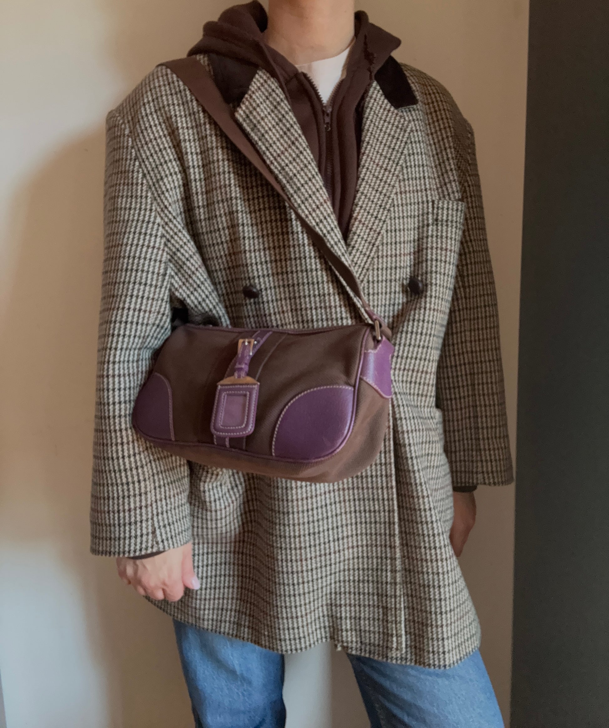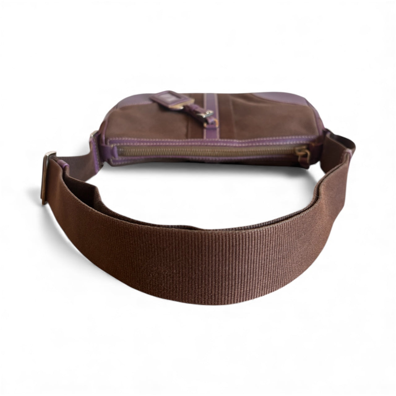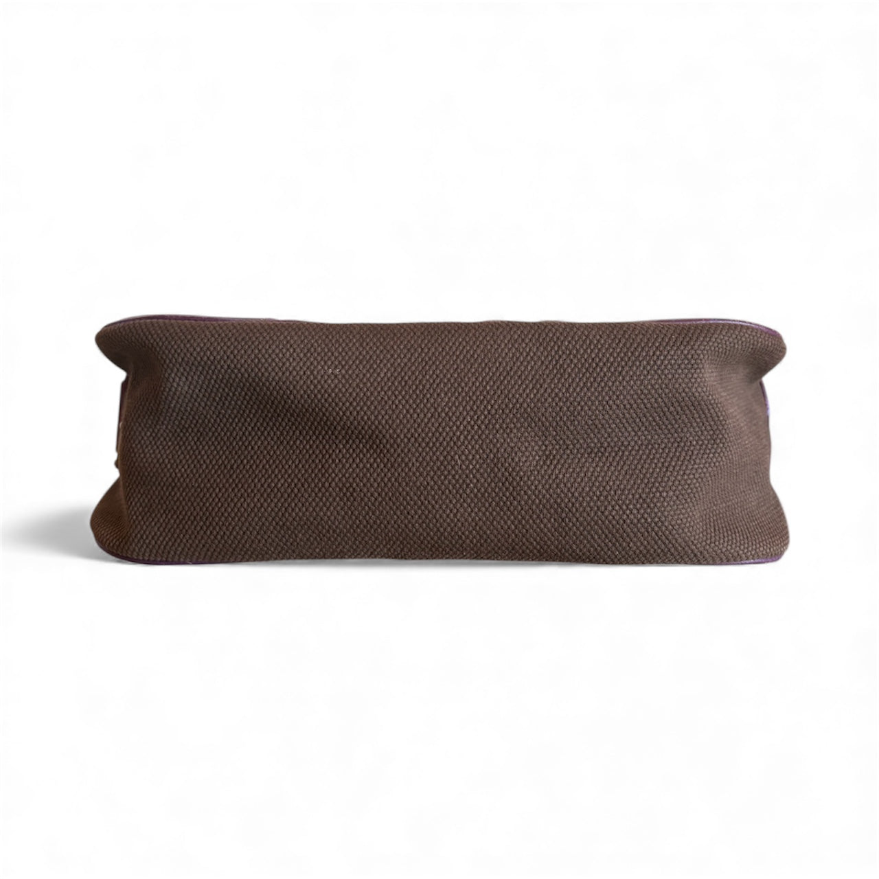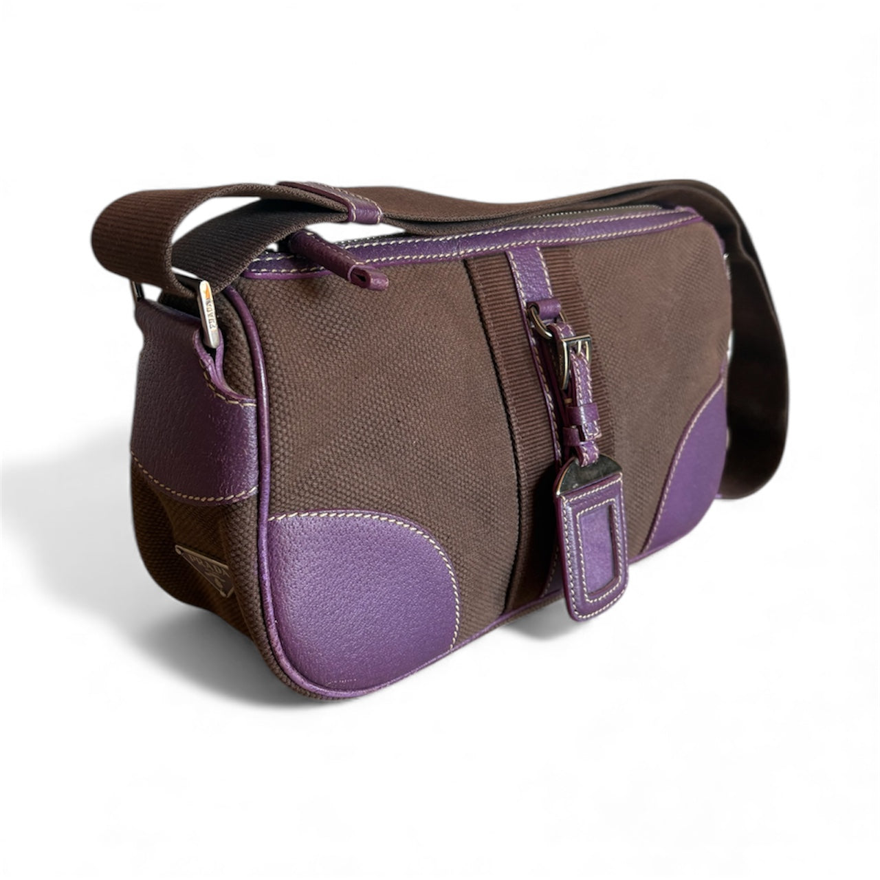 Borsa Prada in tessuto marrone con dettagli in pelle viola.
